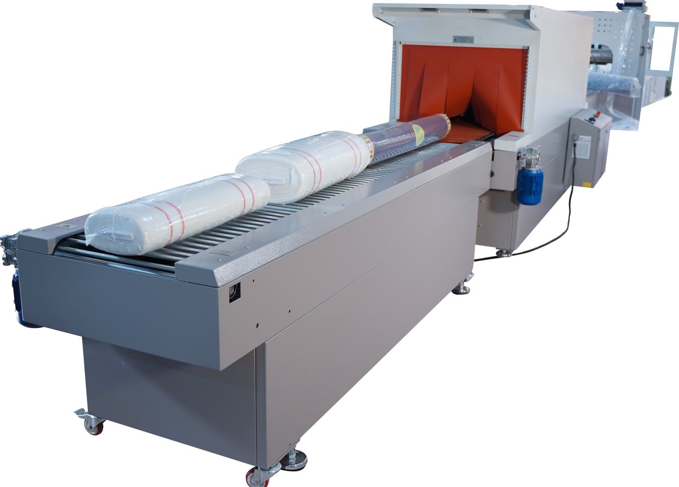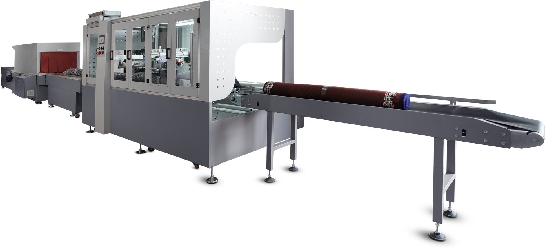 Dokuma, örgü vb. kumaşların, kalite kontrol makinesinden başlayan bir hat boyunca, ambalaj yapılıp, adresleme ile taşıma arabası içerisine kadar taşındığı tam otomatik paketleme makinesidir.